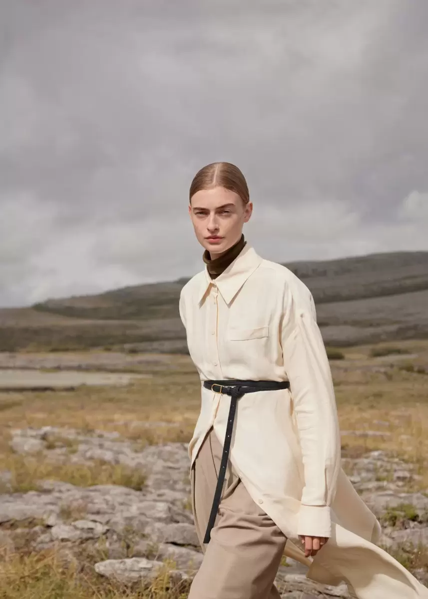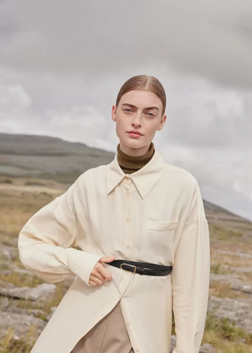 With its lizard print leather double-knot tied around a sober and elegant gold finish buckle, the thin Umi belt is the perfect accessory to emphasize the waist and structure the silhouette.