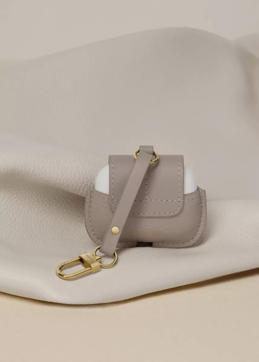 Made from upcycled Polène leather off-cuts, the “Numéro Un” Airpods case reflect the iconic codes of the brand’s famous bag, with hand-stitched folds and a half-moon flap. It closes with an engraved snap and is held together by a key ring.