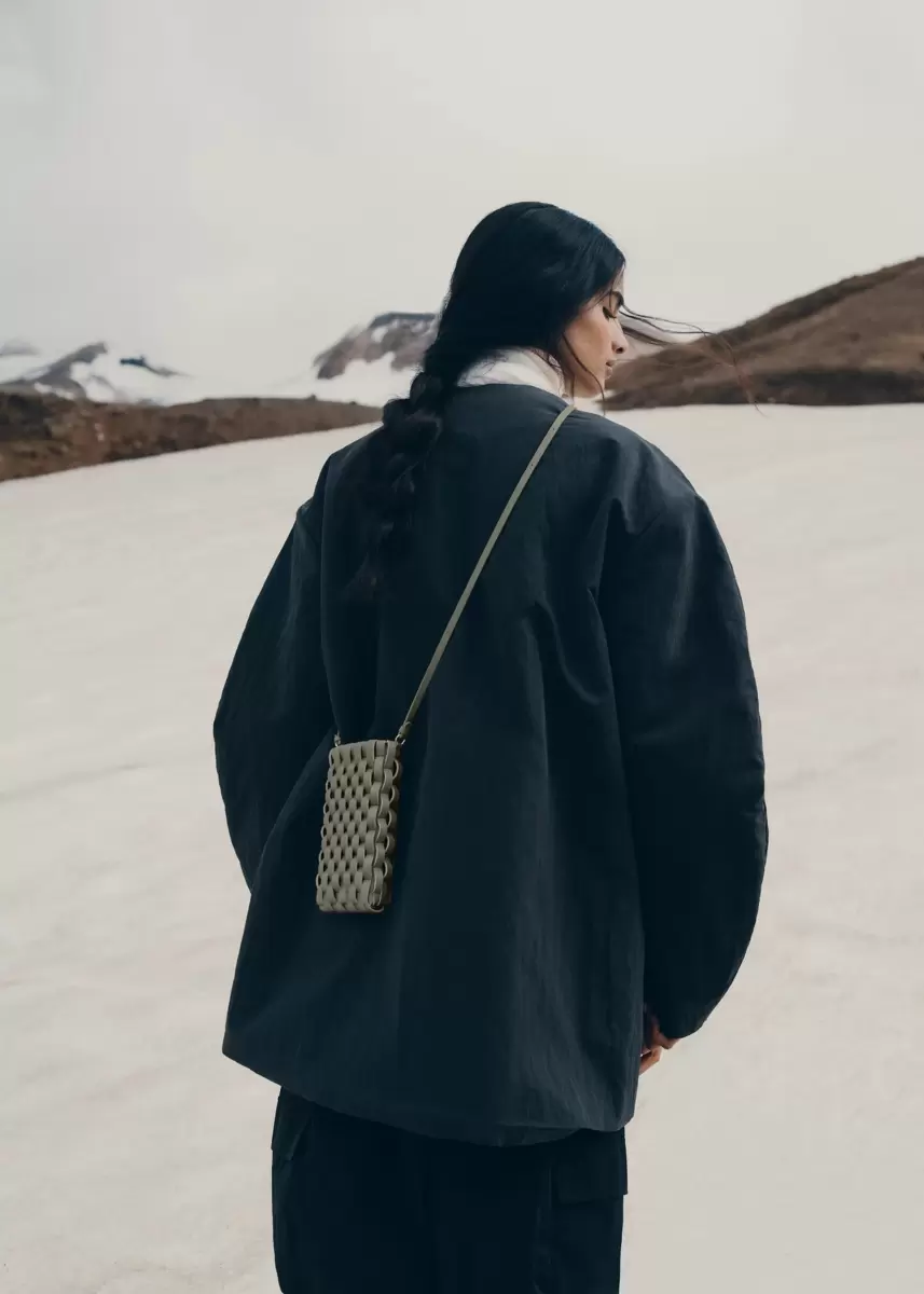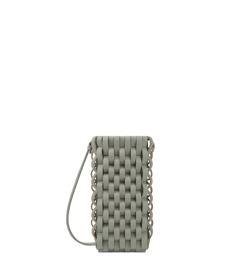 The Onda phone case is shaped by woven strips to form an undulating leather relief texture on the exterior. nWorn crossbody or around the neck, this accessory can also be used as a card holder.