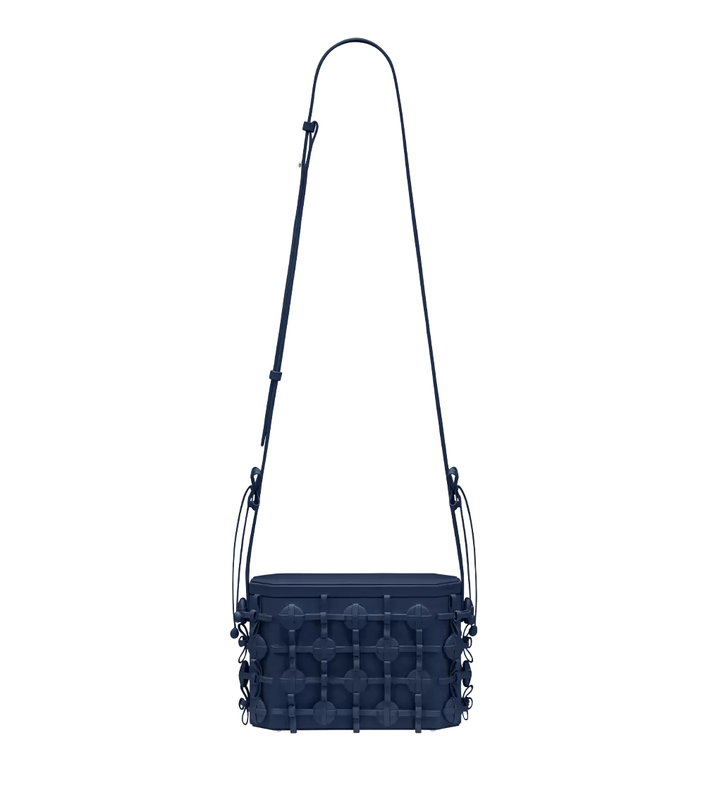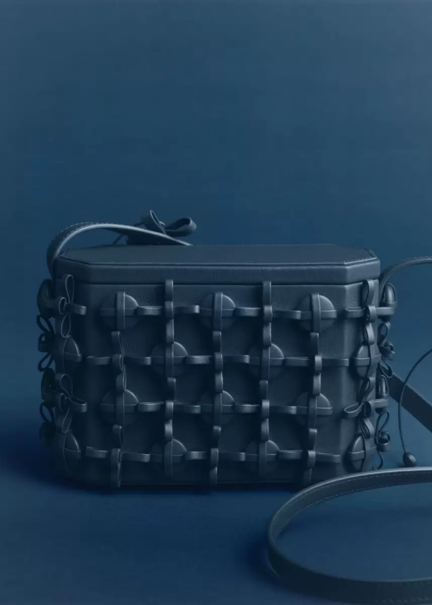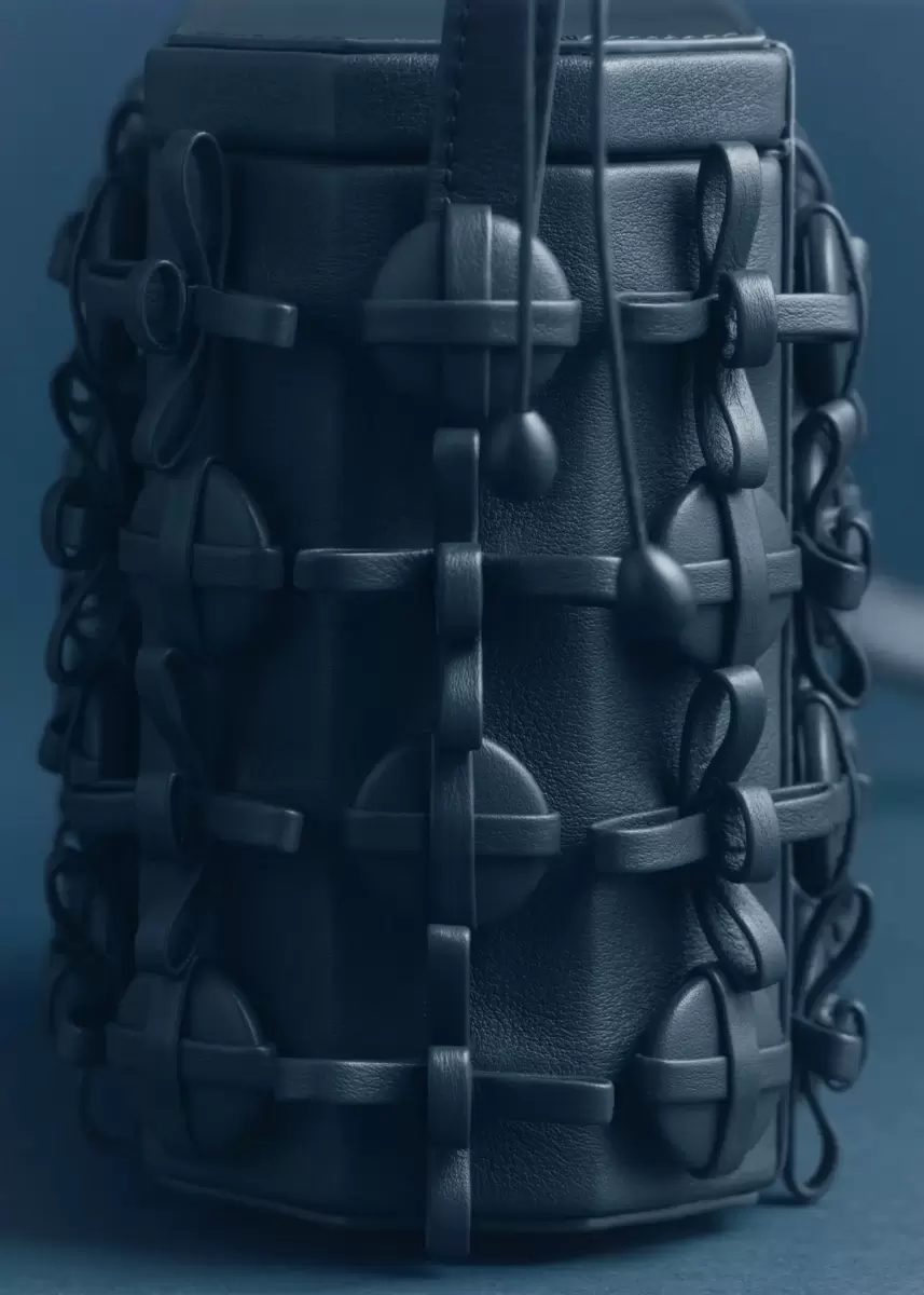 Meticulously sculpted in wood, its structured form is wrapped in supple nappa leather by skilled artisans and adorned with sixty-four hand-stitched buttons and bows. The shoulder strap is decorated with oval droplets held in place by knots.