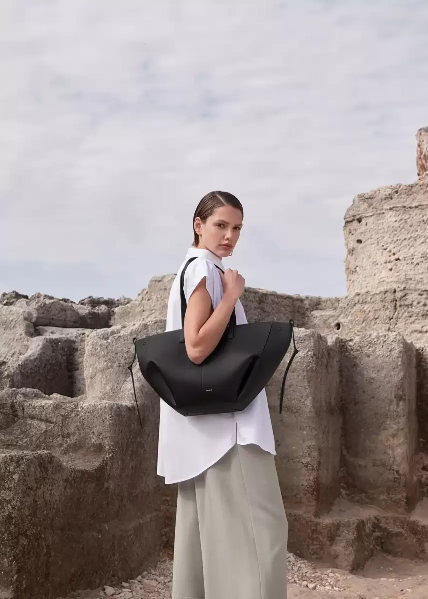 This sculptured tote bag featuring waves, folds, and curves can be used in two ways. Basket-style, with its sides open and straps on the outside, or As a flower-like closed bag, with its sides tucked in and its straps crossed on the inside.