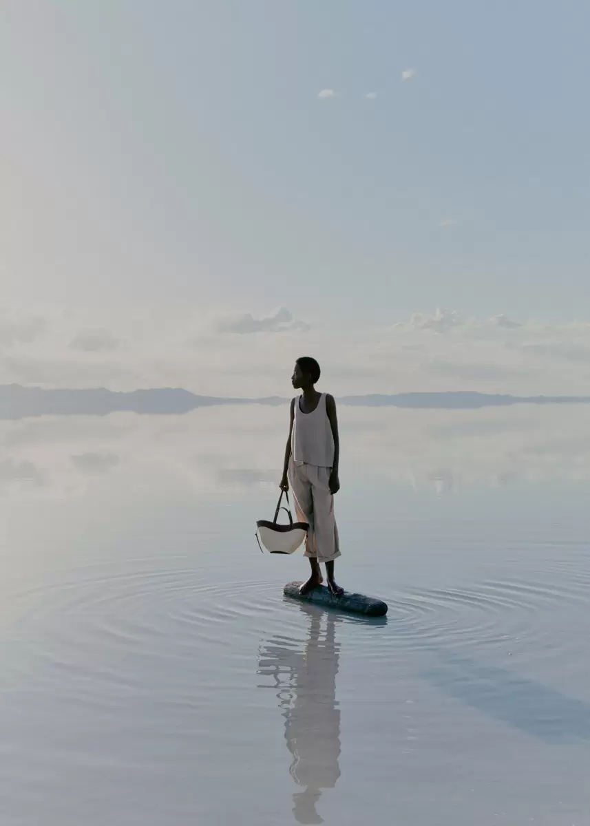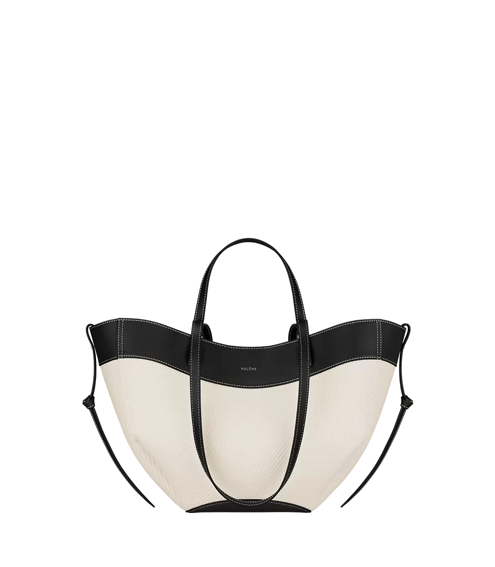 A sculptured compact tote bag featuring waves, folds, and curves. Its straps are hand-knotted and underline its signature shape. The canvas edition is a summer-inspired reinterpretation strengthened by a leather base.