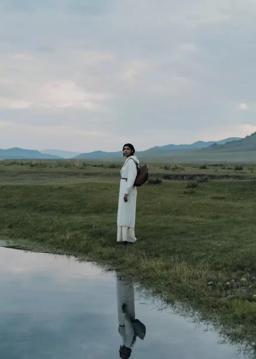 This sculptured compact tote bag featuring waves, folds, and curves can be used in two ways. Basket-style, with its sides open and straps on the outside, or As a flower-like closed bag, with its sides tucked in and its straps crossed on the inside.