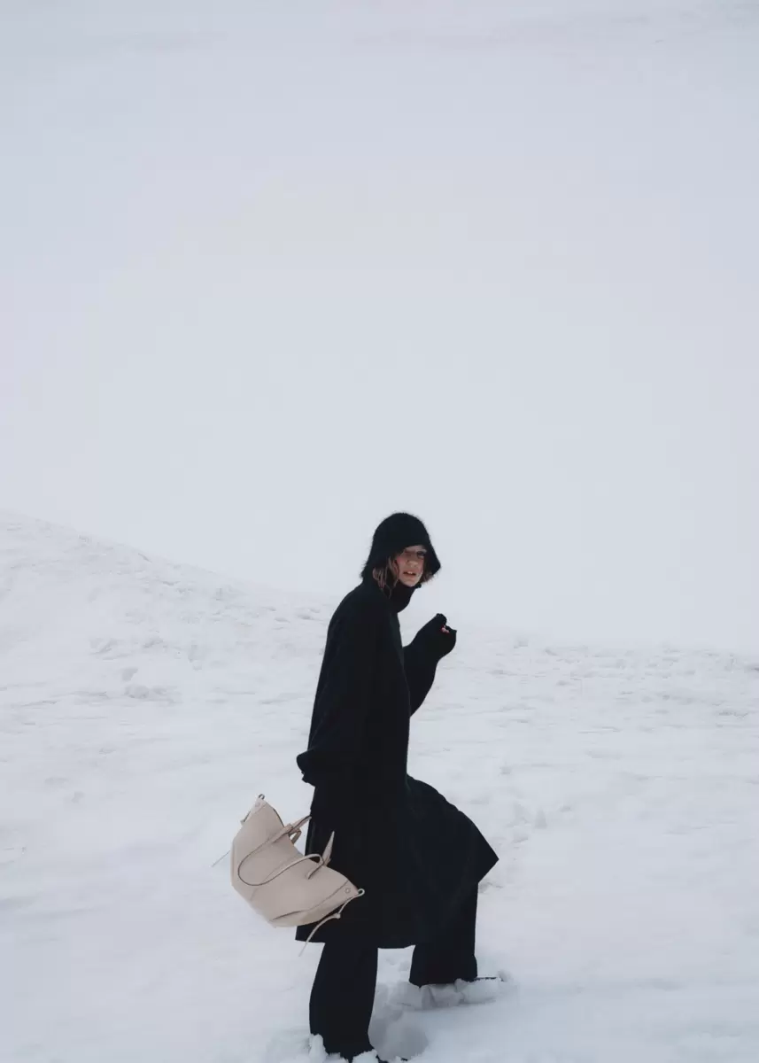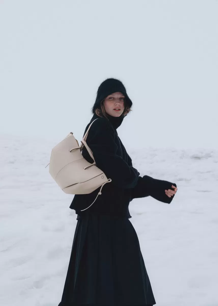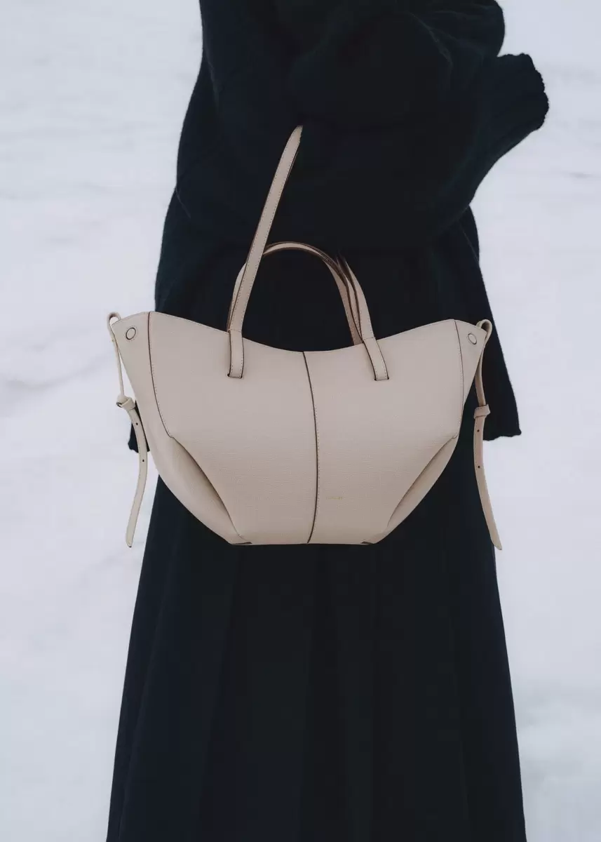 This sculptured compact tote bag featuring waves, folds, and curves can be used in two ways. Basket-style, with its sides open and straps on the outside, or As a flower-like closed bag, with its sides tucked in and its straps crossed on the inside.