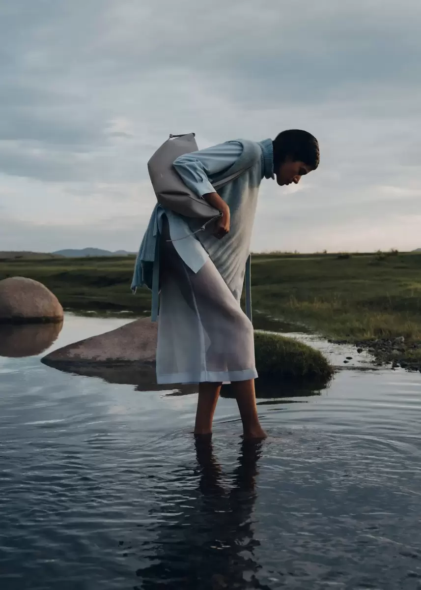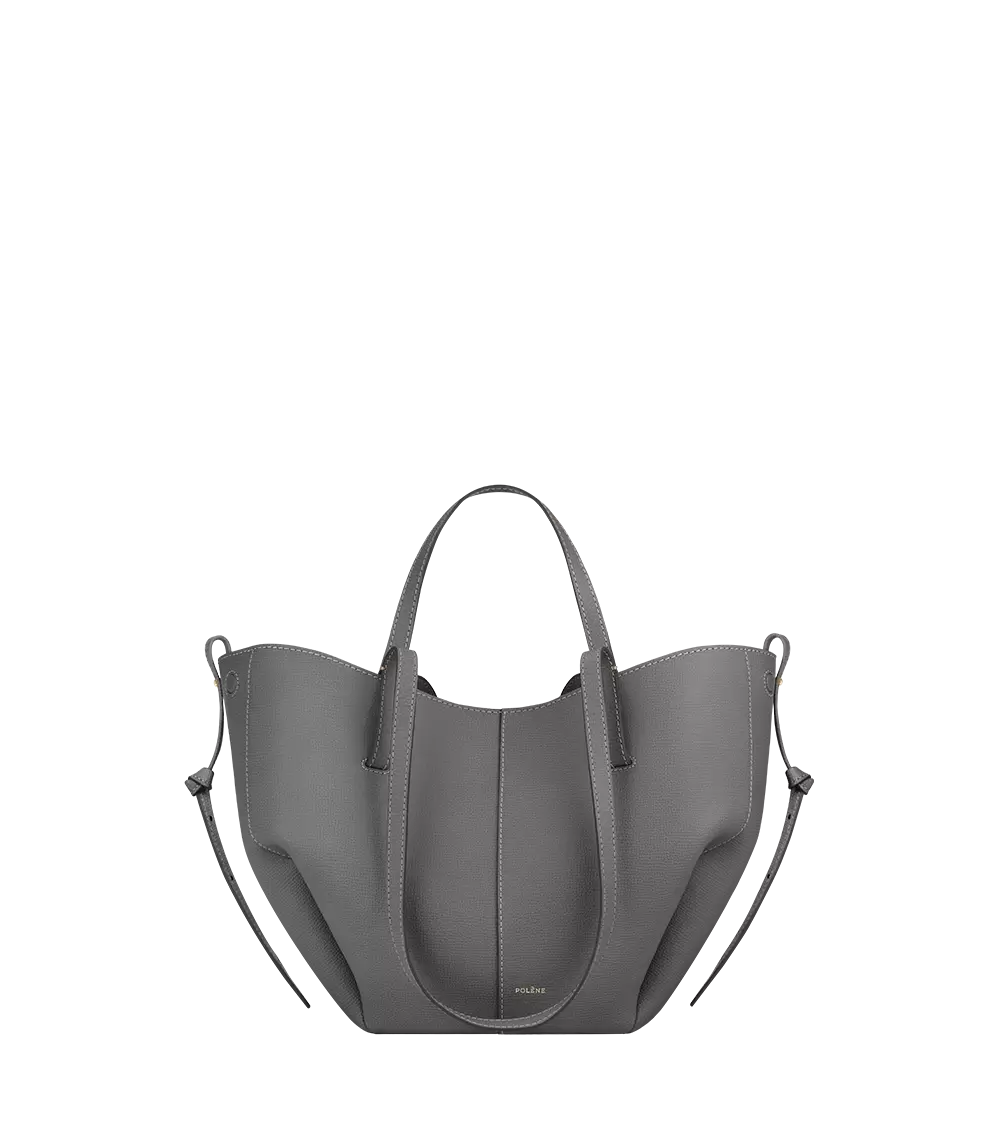 This sculptured compact tote bag featuring waves, folds, and curves can be used in two ways. Basket-style, with its sides open and straps on the outside, or As a flower-like closed bag, with its sides tucked in and its straps crossed on the inside.