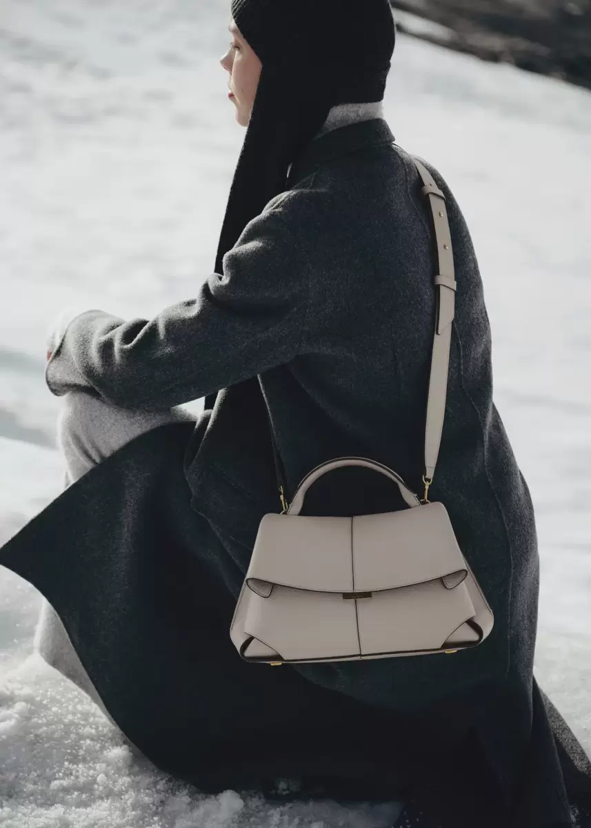 The "Mokki" model showcases the art of folding with its textured leather. The corners are cut to reveal smooth leather for a subtle interplay of textures. The bag’s interior is roomy and divided into compartments, all protected by a flap that features an engraved clasp. With its adjustable shoulder strap held in place