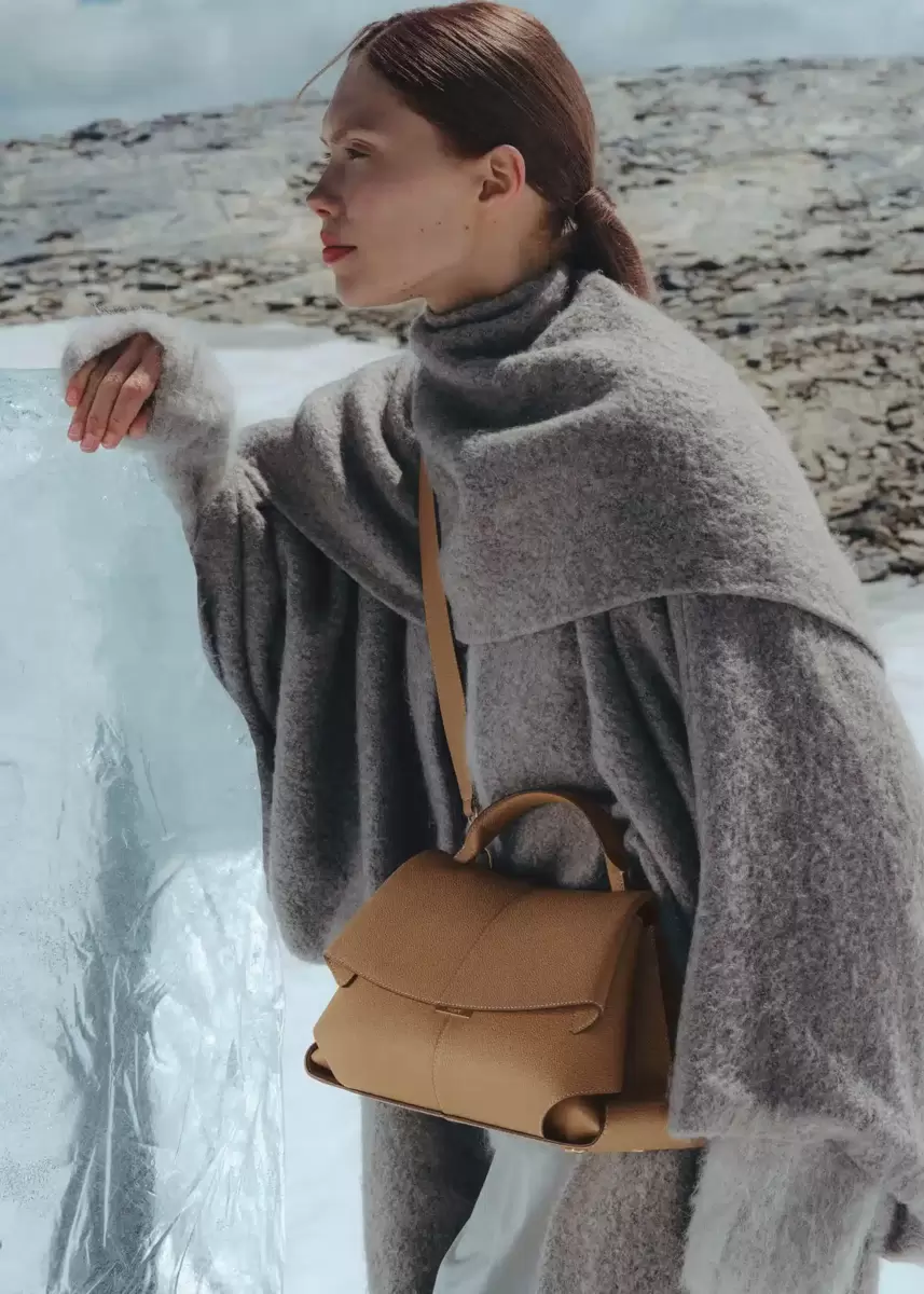 The “Mokki” model showcases the art of folding with its textured leather. The corners are cut to reveal smooth leather for a subtle interplay of textures. The bag’s interior is roomy and divided into compartments, all protected by a flap that features an engraved clasp. With its adjustable shoulder strap held in place by snap hooks, the model smoothly adapts to your movements.