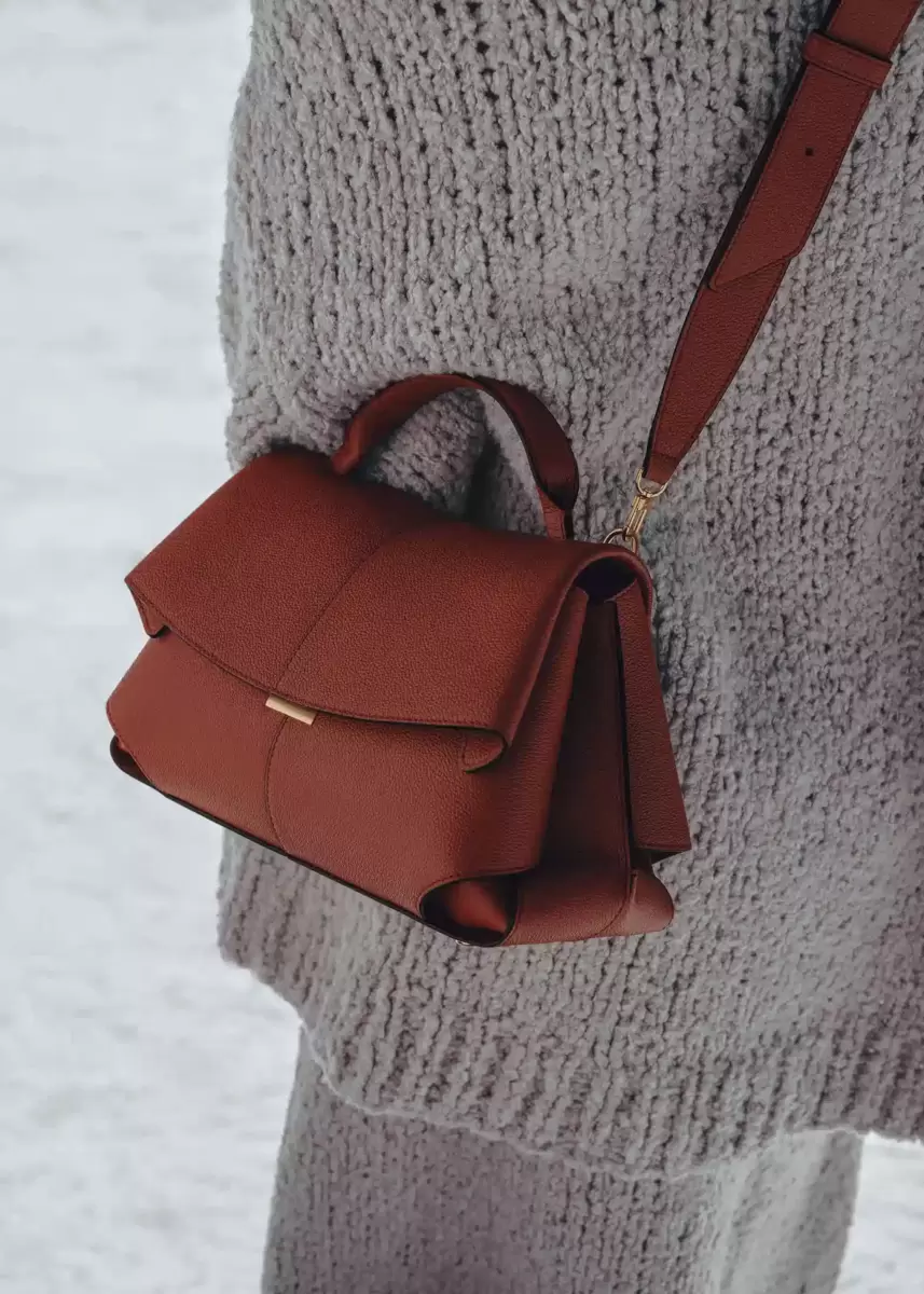The "Mokki" model showcases the art of folding with its textured leather. The corners are cut to reveal smooth leather for a subtle interplay of textures. The bag’s interior is roomy and divided into compartments, all protected by a flap that features an engraved clasp. With its adjustable shoulder strap held in place