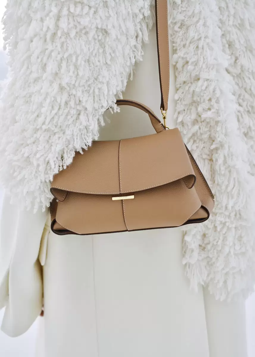 Ingeniously constructed from thirty-six leather panels, the “Mokki Mini” model celebrates the art of folding through a subtle interplay of textured and smooth leathers. The bag’s interior is divided into compartments, all protected by a flap that features an engraved clasp. With its adjustable shoulder strap held in place by snap hooks, the model smoothly adapts to your movements.