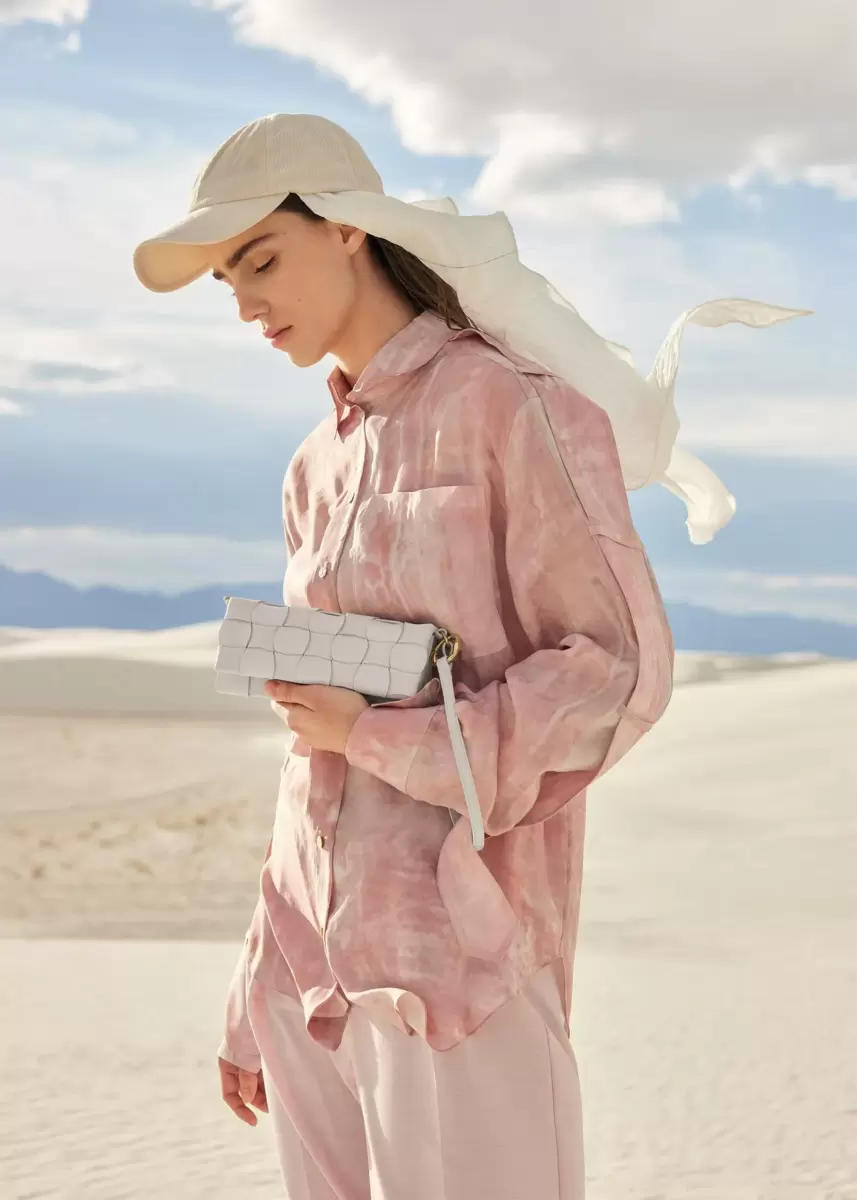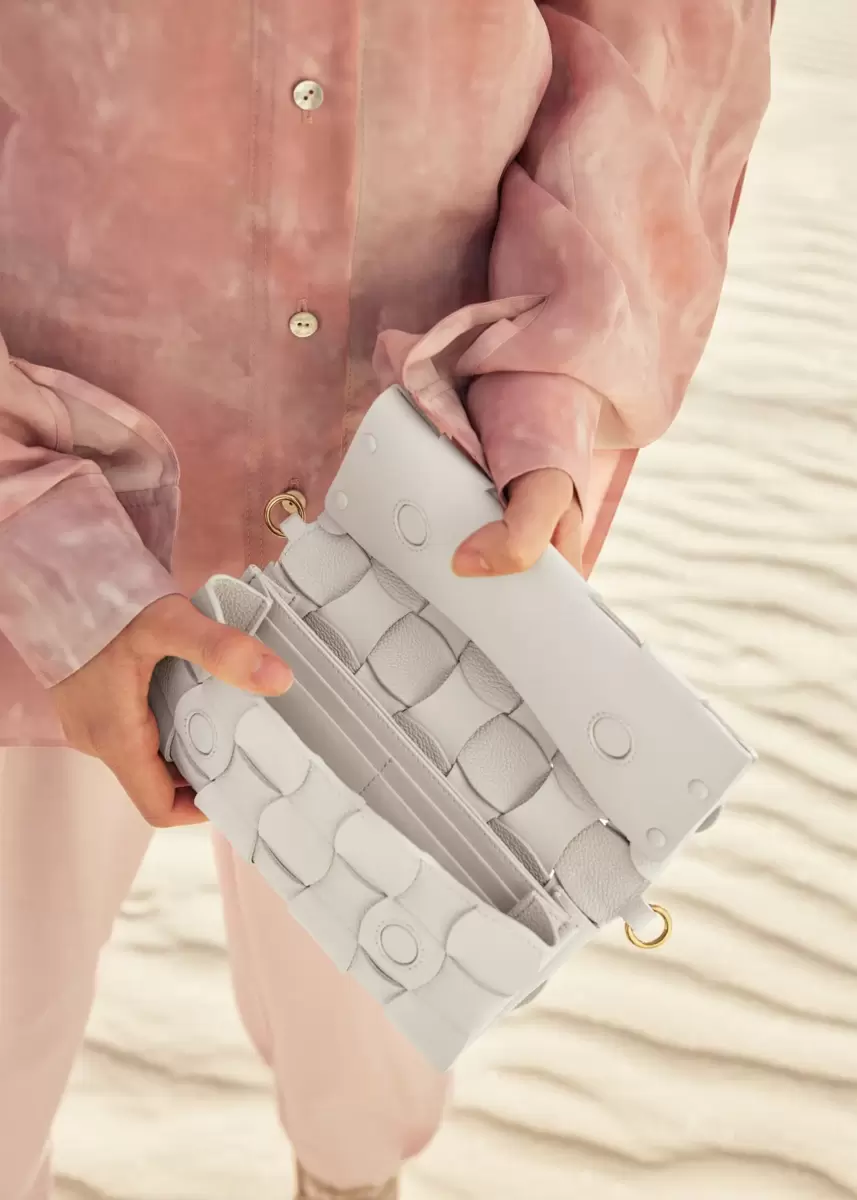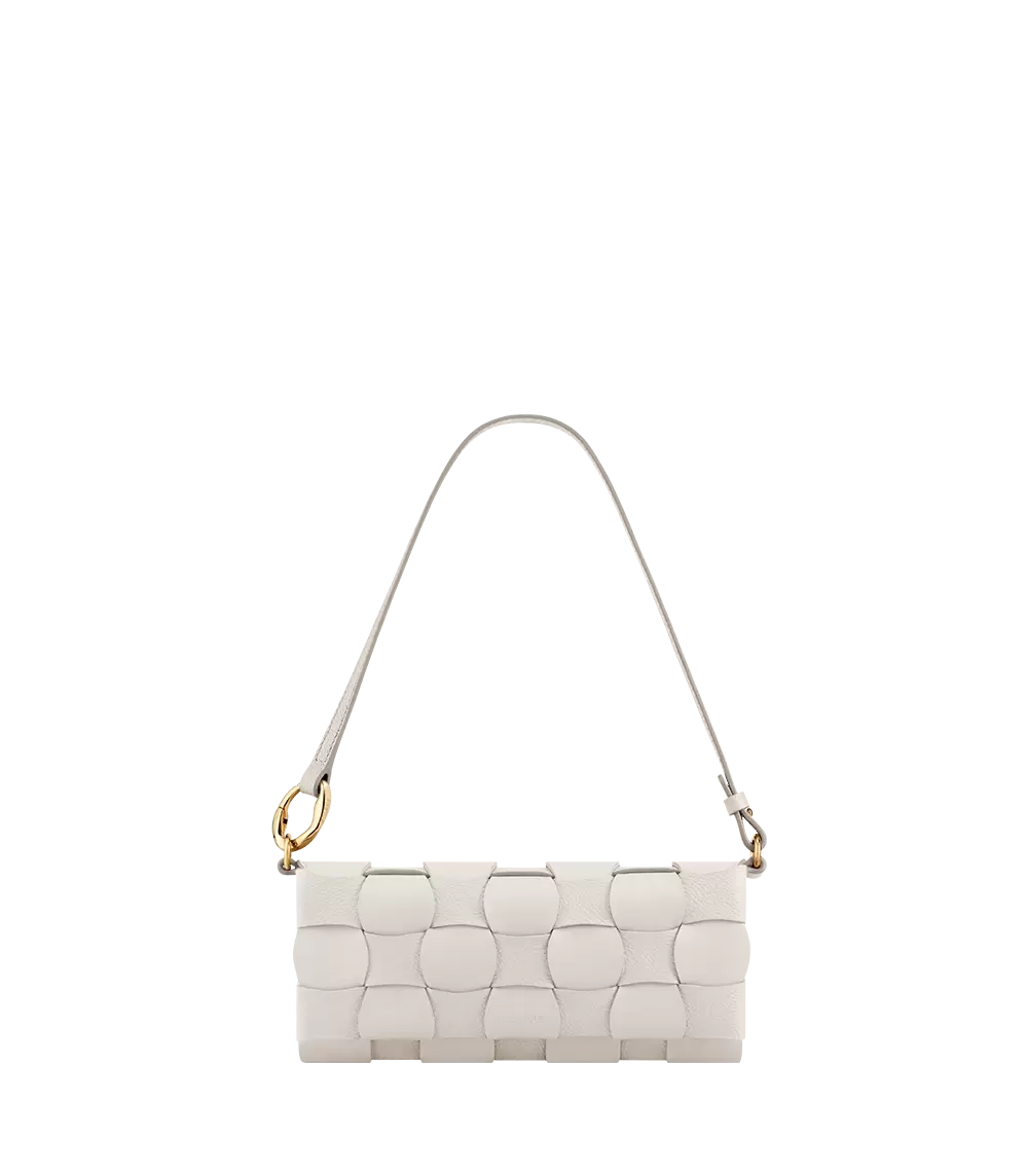 The Neiti model reinterprets an iconic leather goods braiding technique by softening it with wave-like undulating lines, along with interconnecting smooth and grained tone-on-tone leathers. Clever folds give the mini-bag its shape and volume.