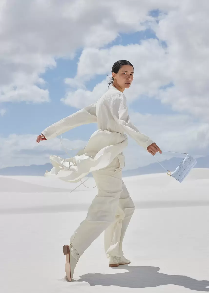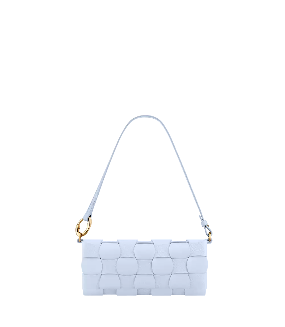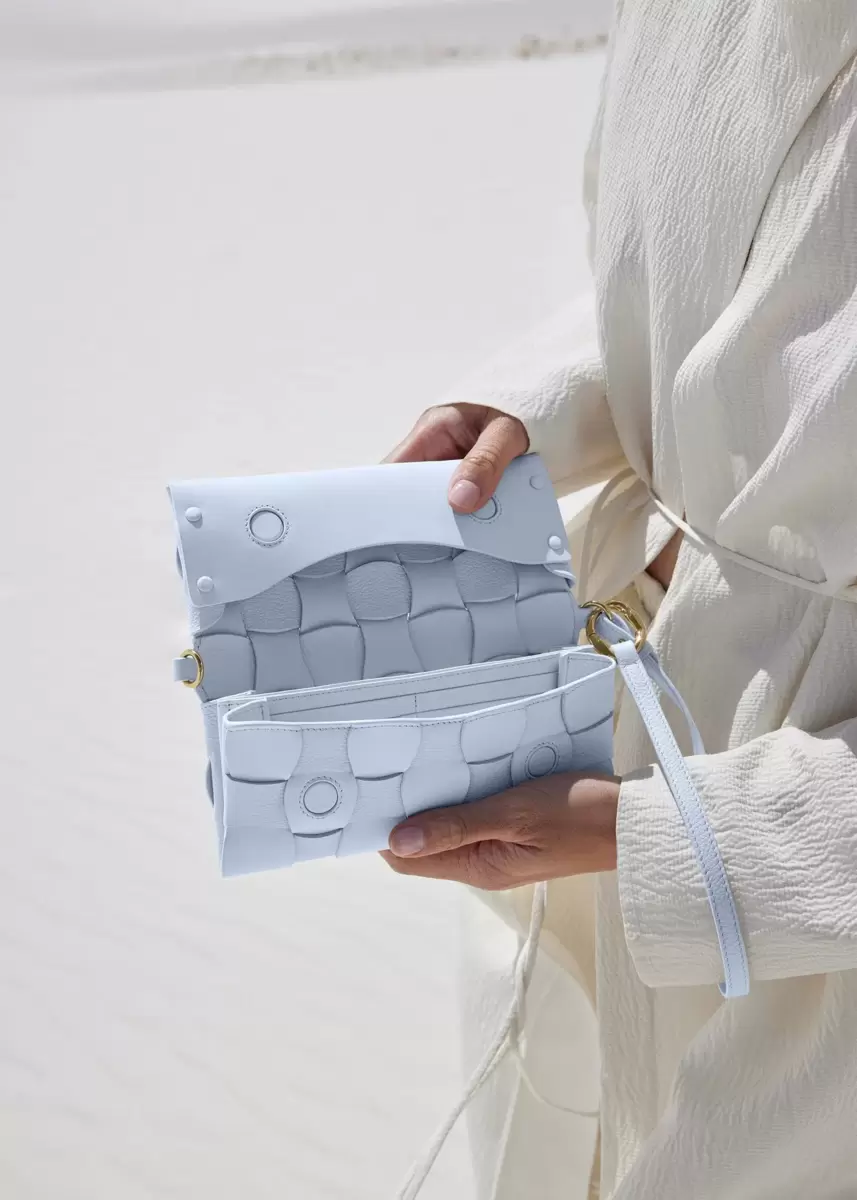 The Neiti model reinterprets an iconic leather goods braiding technique by softening it with wave-like undulating lines, along with interconnecting smooth and grained tone-on-tone leathers. Clever folds give the mini-bag its shape and volume.