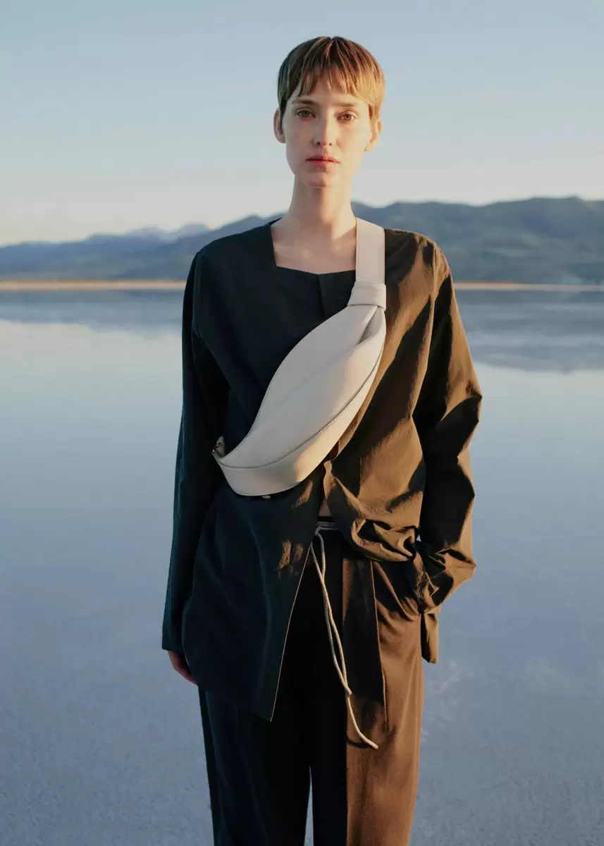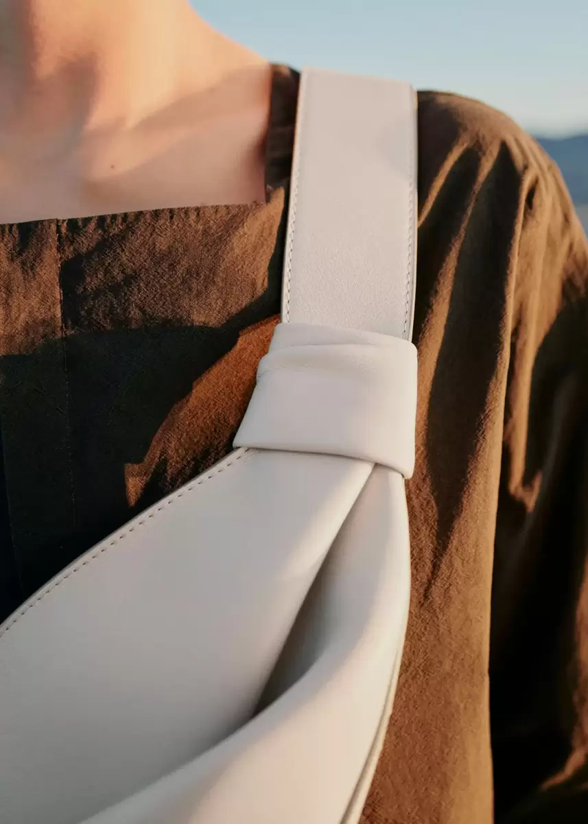 Cut from nappa leather, the Neyu model features draped leather structured around a central fold. Its pattern is shaped to hug the body and move with it throughout the day’s activities. Its wide shoulder strap adjusts for wearing the bag crossbody or over the shoulder.