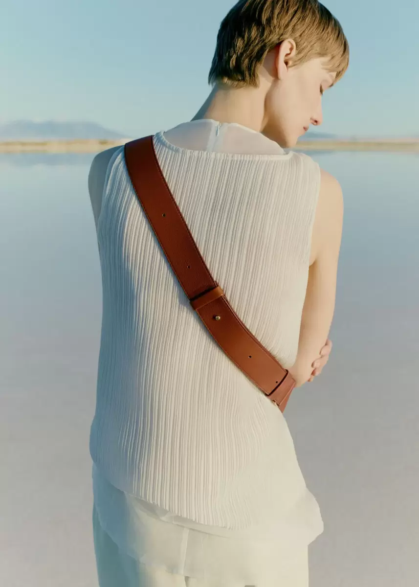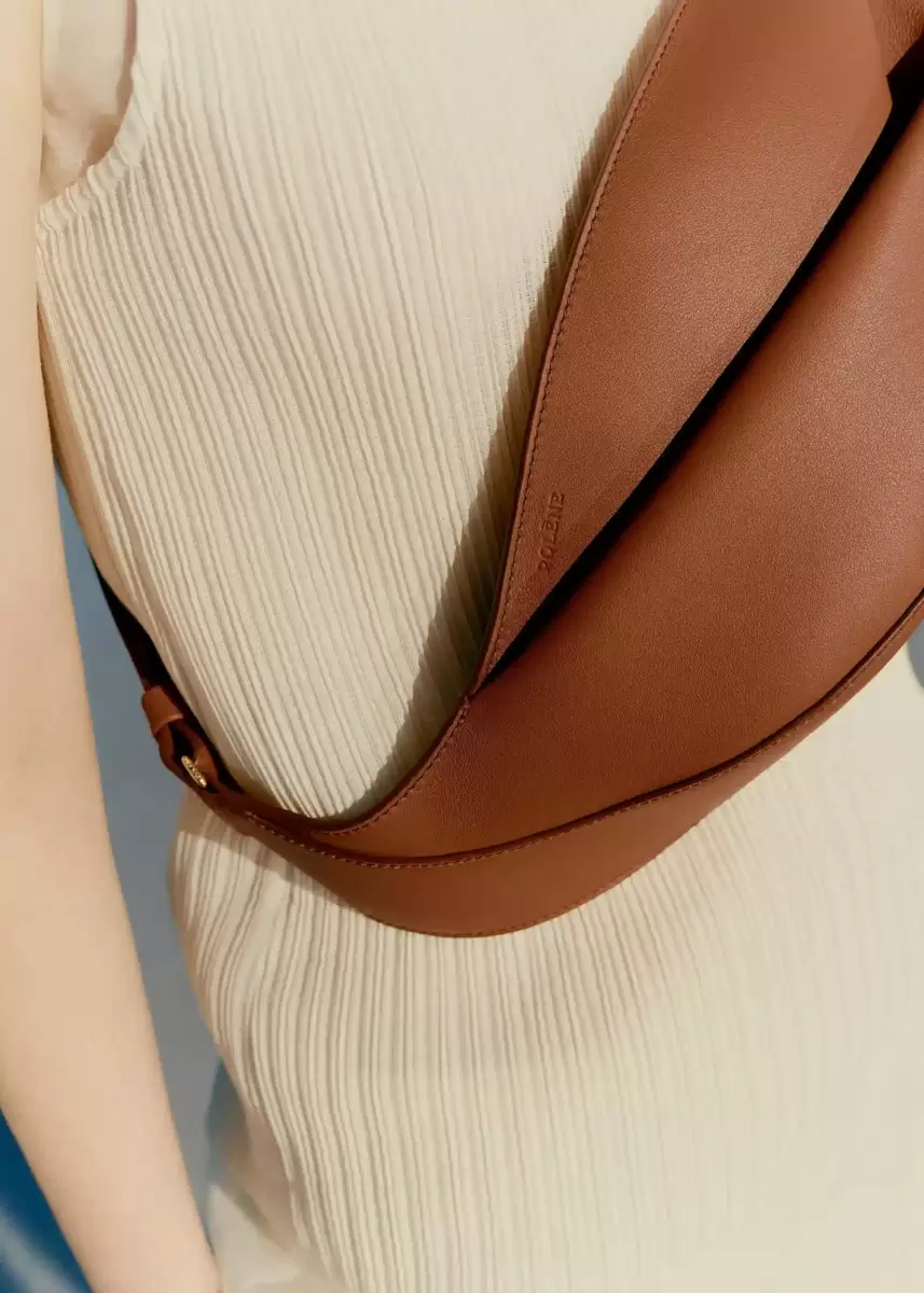 Cut from nappa leather, the Neyu model features draped leather structured around a central fold. Its pattern is shaped to hug the body and move with it throughout the day’s activities. Its wide shoulder strap adjusts for wearing the bag crossbody or over the shoulder.