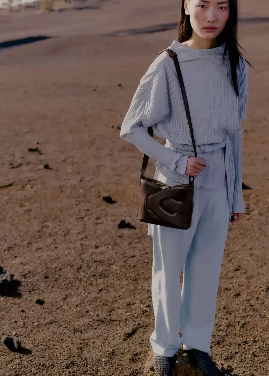 Composed of two matching and intertwined leather modules, the “Nodde” model is a bag with interlaced lines, highlighted by meticulous stitching and perfect symmetry.