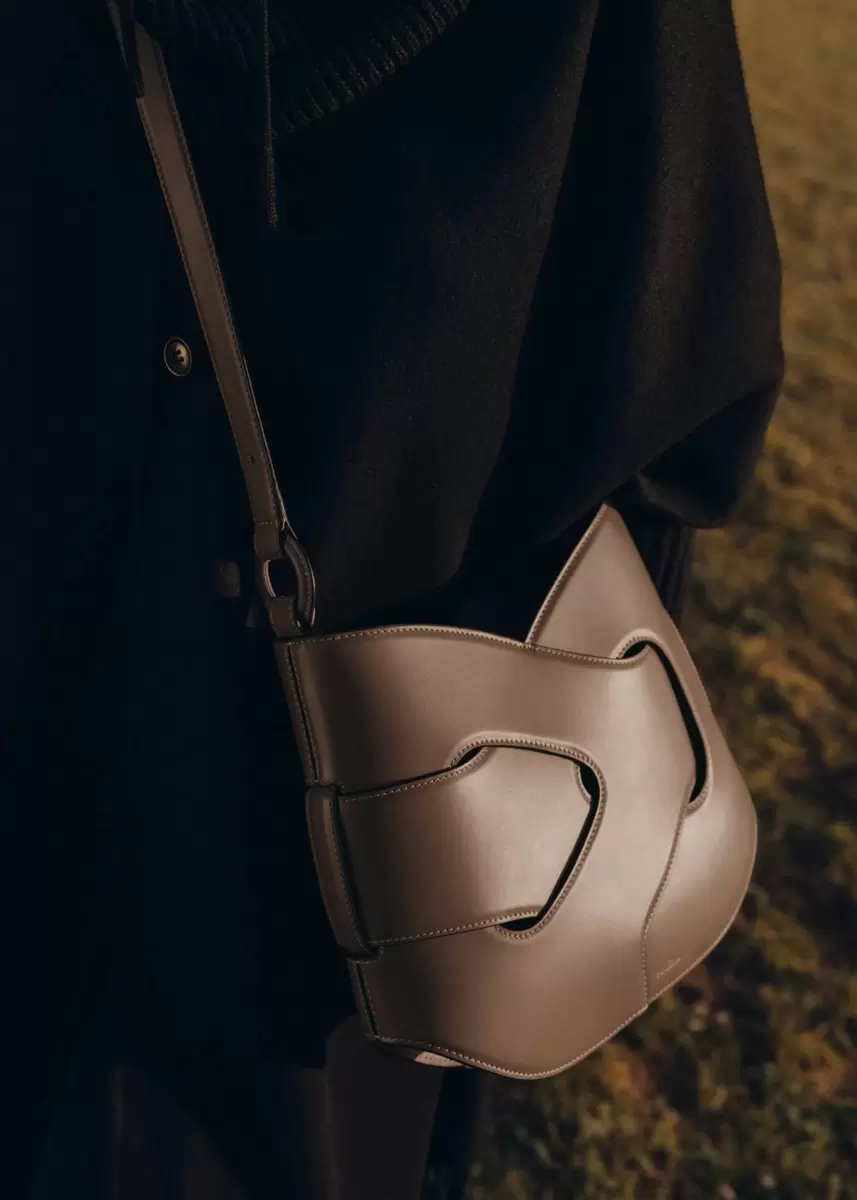 The “Nodde Hobo,” whose name echoes the French word for “knot,” is made up of two perfectly symmetrical, intertwined leather modules. Its beveled design accentuates its dynamic design and its base, set into the main body of the bag using a distinctive assembly technique.