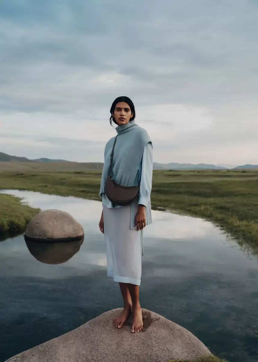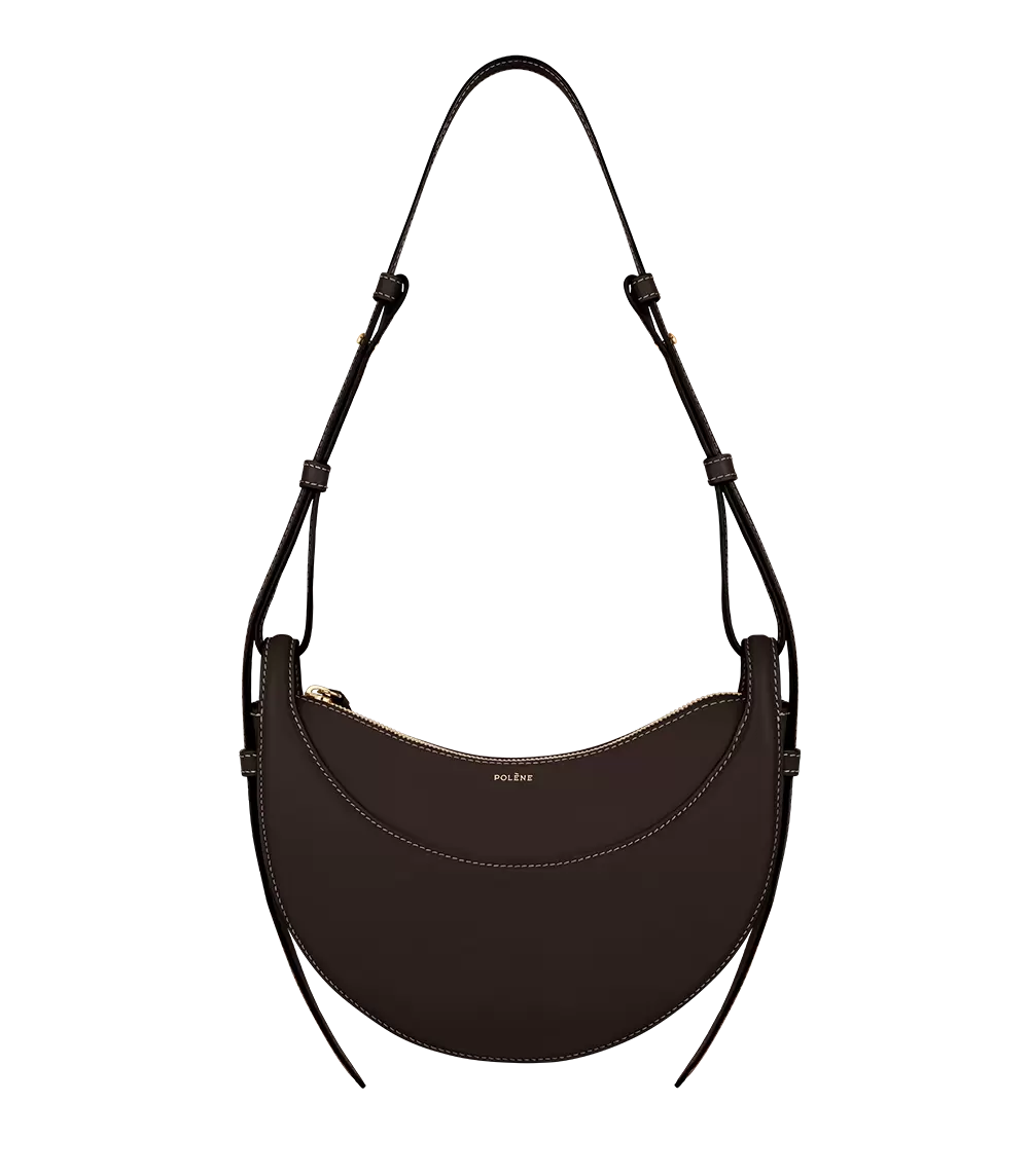 With its rounded shape, foam padding, and hand-stitching, the “Numéro Dix” is a nod to the equestrian codes of saddlery. Its half-moon design highlights juxtaposing curves.