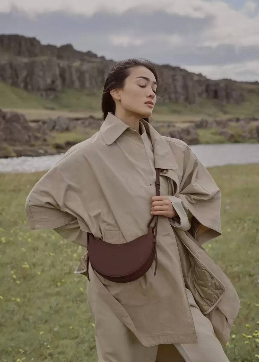 With its rounded shape, foam padding, and hand-stitching, the “Numéro Dix” is a nod to the equestrian codes of saddlery. Its half-moon design highlights juxtaposing curves.