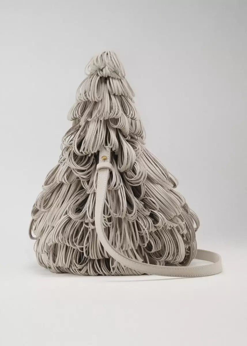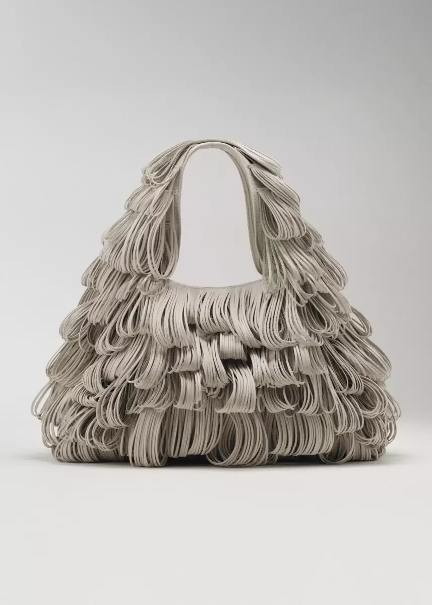 • Leather off-cuts are transformed into fringed loops and then hand-sewn to the main body of the bag by leather goods artisans in Ubrique, Spain.