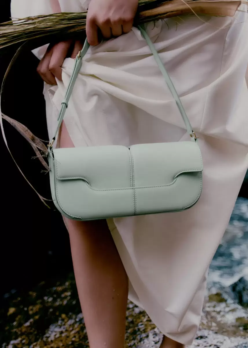 The Osmo model’s design is constructed using mirrored leather segments that interlock to form a symmetrical whole.nWith its flap closure, this finely made bag is cut from smooth nappa calf leather, known for its natural beauty and distinctive feel, which covers the bag’s interior and exterior. The adjustable shoulder strap can be worn short, “baguette” style.