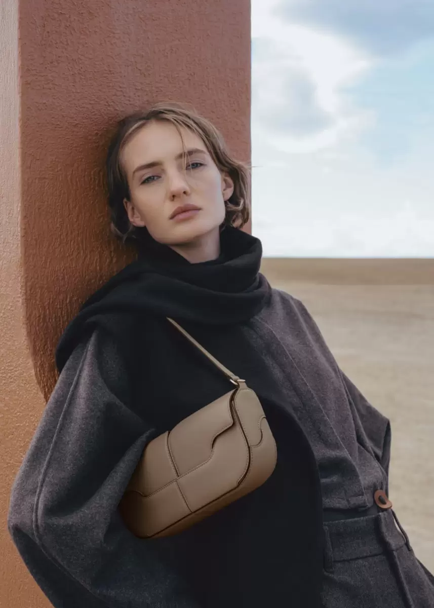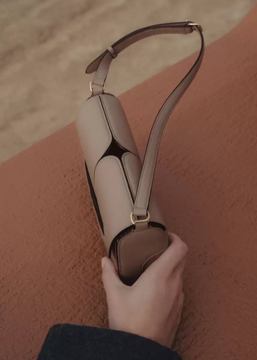 The Osmo model’s design is constructed using mirrored leather segments that interlock to form a symmetrical whole.nWith its flap closure, this finely made bag is cut from smooth nappa calf leather, known for its natural beauty and distinctive feel, which covers the bag’s interior and exterior. The adjustable shoulder strap can be worn short, “baguette” style.
