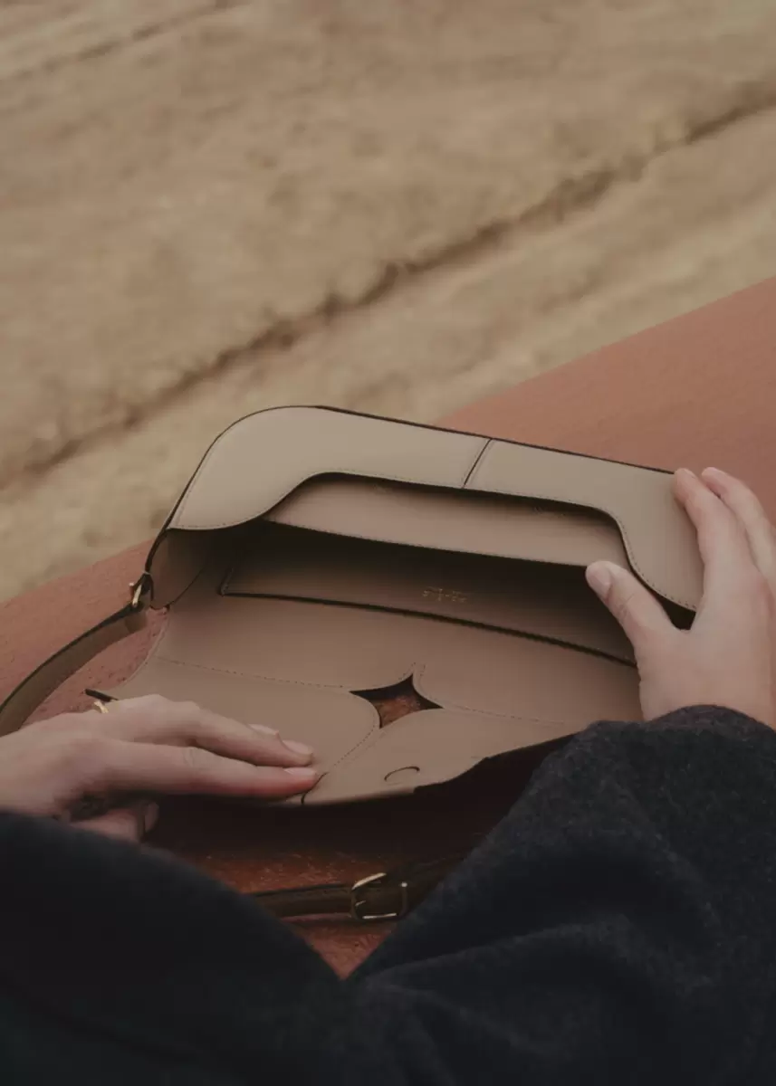 The Osmo model’s design is constructed using mirrored leather segments that interlock to form a symmetrical whole. With its flap closure, this finely made bag is cut from smooth nappa calf leather, known for its natural beauty and distinctive feel, which covers the bag’s interior and exterior. The adjustable shoulder s