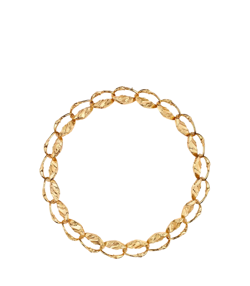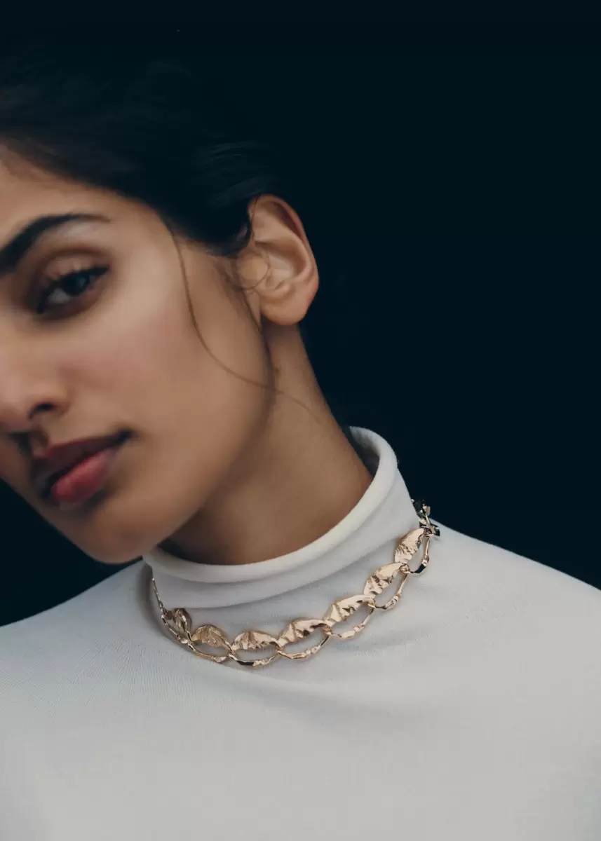 The Eroz chain links are distinguished by their texture, reminiscent of molten rock. When the rings are intertwined, the skin is exposed, like a precious material set into the jewelry.
