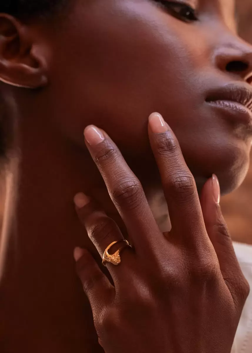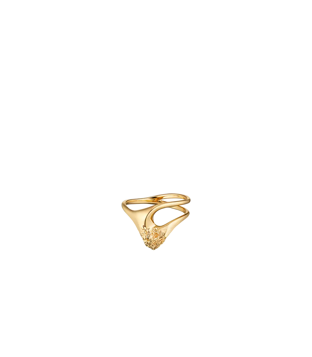 Two flowing, limpid lines encircle the finger before joining together to form a mineral gem. Full of contrasts, this piece of jewelry strikes the perfect balance between elegance and personality.