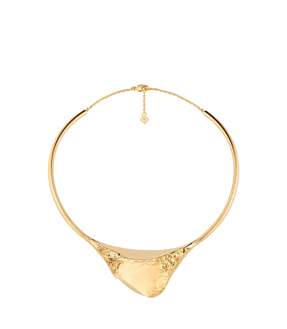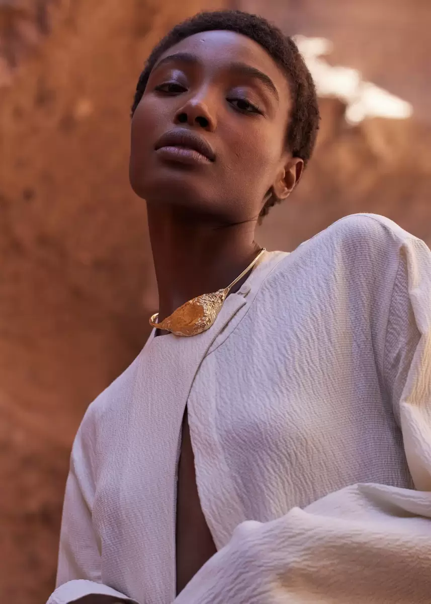A piece featuring a bold design, forming a strong contrast between a fine line adorning the neck and a sculptural central piece, like a rugged shard of rock nestled against the skin.