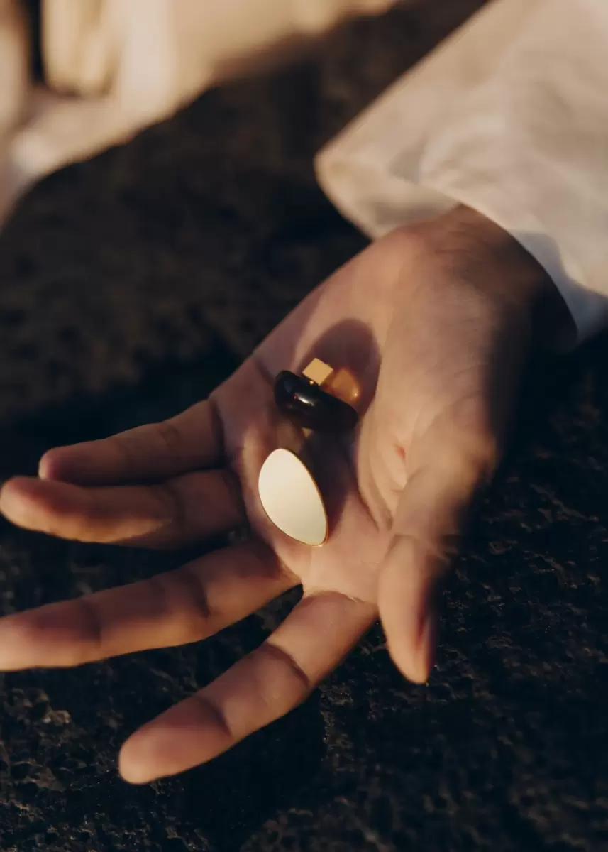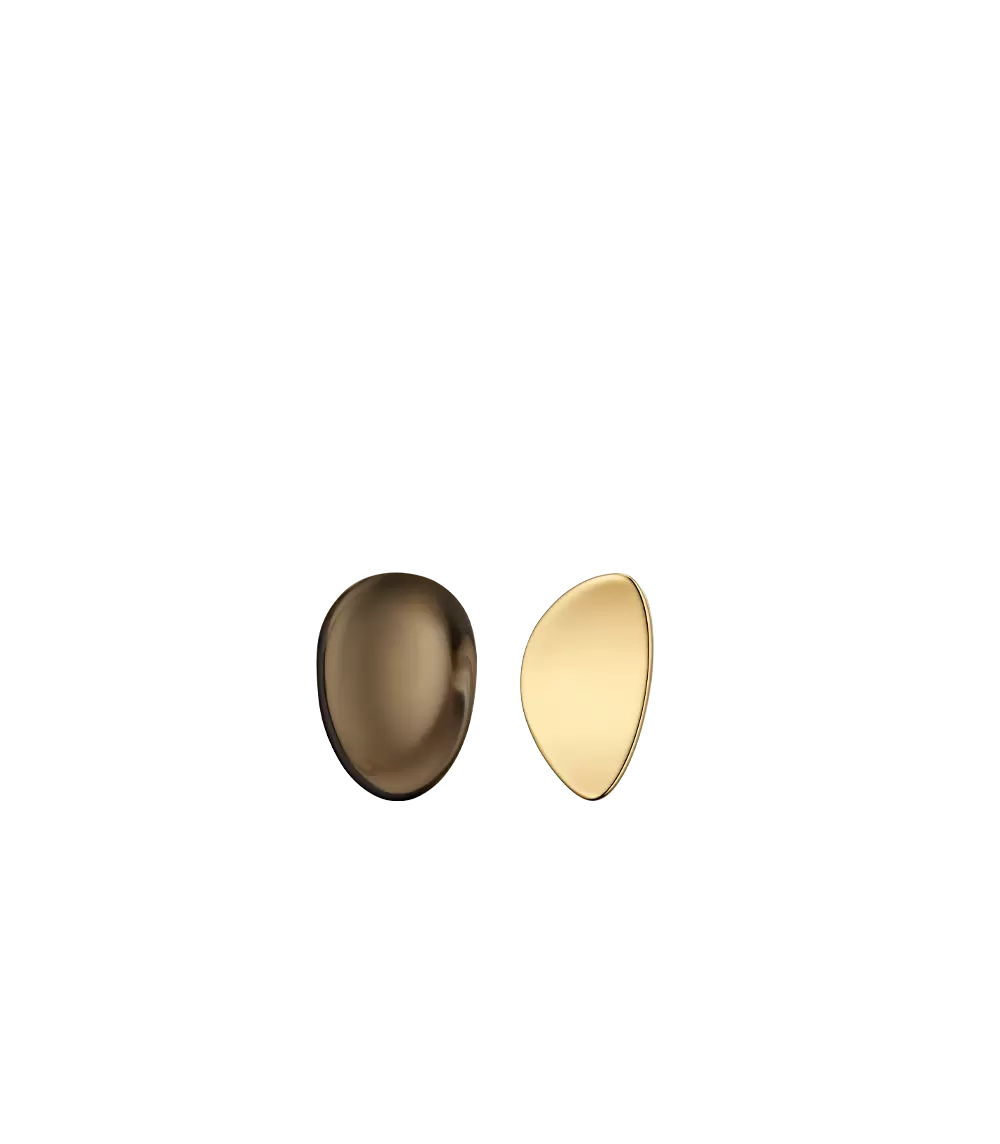 An asymmetrical pair of earrings mirroring a glass dewdrop, its shape imitated in a gold-plated brass droplet.