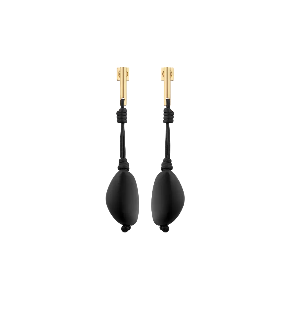 Sculpted black marble pebbles are held in place using delicate, hand-knotted leather cording.